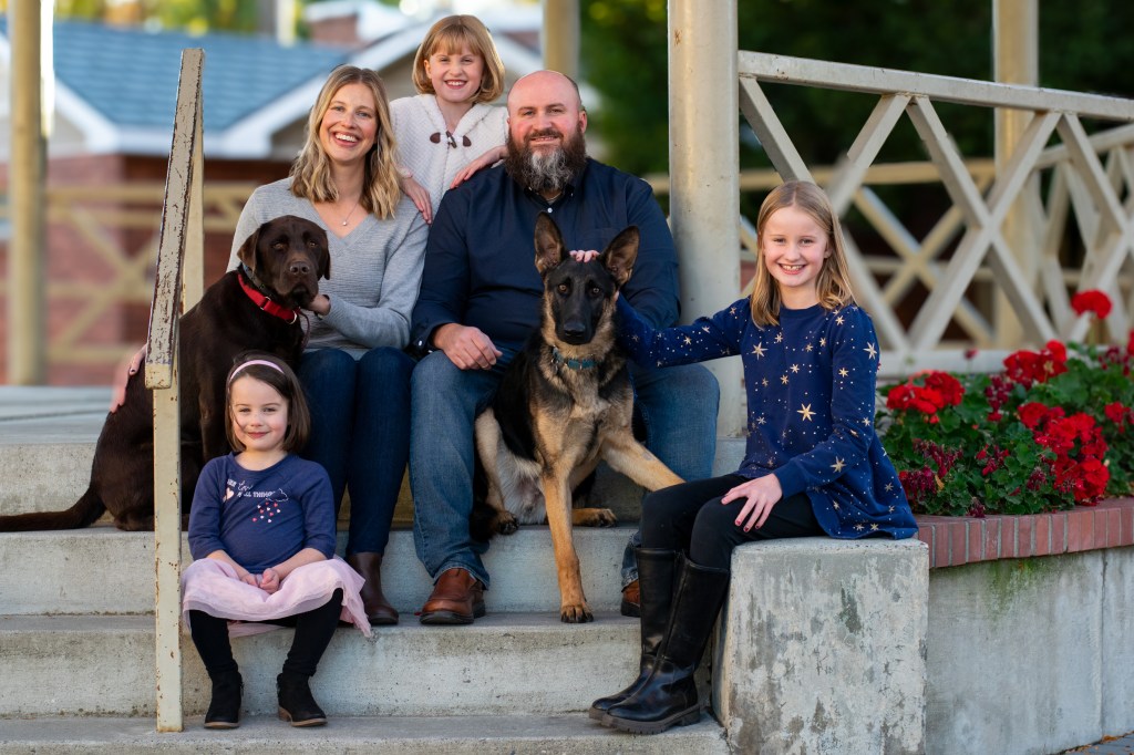 Josh, Anna, Natalie, Eva, and Judith with their sweet dogs Gunner and Boomer.